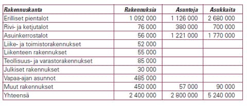 Maassamme on lähes kolme miljoonaa asuntoa, joista kuitenkin vain reilu neljännes on asuntoosakeyhtiömuotoisia, vaikka ensimmäiset taloyhtiöt perustettiin jo reilu sata vuotta sitten. Suomen väkilukuun verrattuna asuntojen ja rakennusten määrä on varsin suuri. Niinpä rakennukset kattavatkin lähes puolet koko kansallisvarallisuudestamme.
